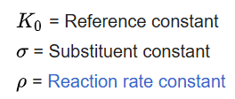 relating the equilibrium constant, K, for a given equilibrium reaction with substituent R and the reference constant K0 when R is a hydrogen atom to the substituent constant σ which depends only on the specific substituent R and the reaction rate constant ρ which depends only on the type of reaction but not on the substituent used.