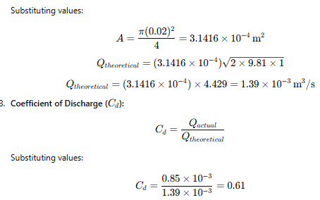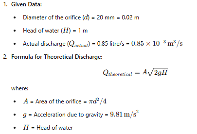 The head of water over the centre of an orifice of diameter 20 mm is 1 m.The actual discharge through the orifice is 0.85 litre/s. Find the coefficient of discharge.
