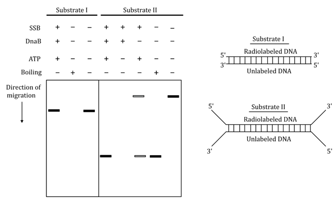Conditions tested: Presence/absence of SSB, DnaB, ATP, and boiling control.