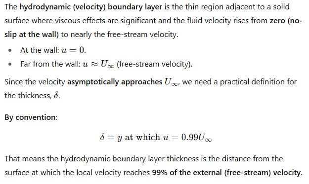 The hydrodynamic boundary layer thickness is defined as the distance from the surface where the