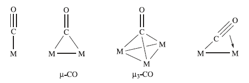 In multinuclear metal species, CO ligands may adopt terminal or bridging modes.