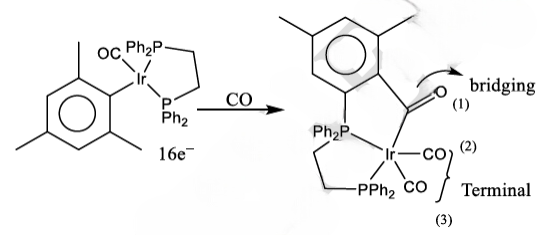 Ir is a nine electron donor. CO is a two electron donor. 1,2-Bis(diphenylphosphino)ethane (dppe) is a four electron donor. Substituted phenyl donates one electron.