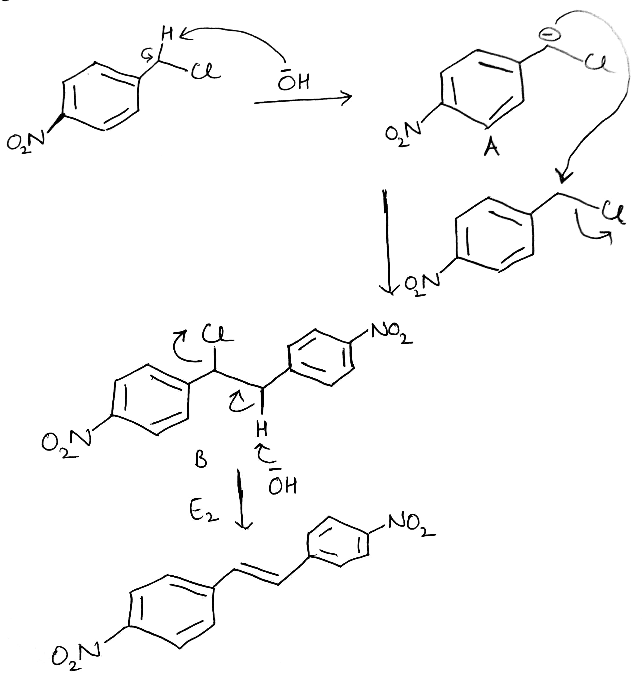 Hydroxide ion (-OH) will act as a base and abstract the acidic hydrogen (H+). The carbanion generated will get stabilized by the electron withdrawing NO2 group (present at para position) and the Cl atom. The generated carbanion will attack another molecule of the substrate.
