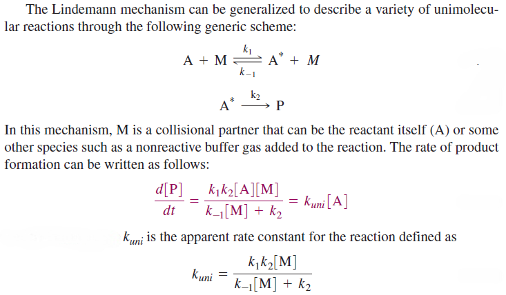 The Lindemann mechanism for unimolecular reactions provides an elegant example of the relationship between kinetics and reaction mechanisms. This mechanism was developed to describe the observed concentration dependence in unimolecular dissociation reactions of the form