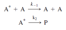 In this reaction, A* is the “activated” reactant that has received sufficient energy to undergo decomposition. The collisional partner of the activated reactant molecule leaves the collision with insufficient energy to decompose. In the second step of the Lindemann mechanism, the activated reactant undergoes one of two reactions: collision resulting in deactivation or decomposition resulting in product formation: