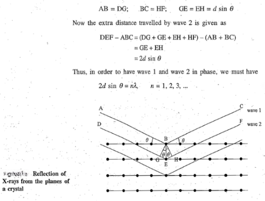 Let θ be the incident angle of monochromatic X-rays of wavelength λ with the parallel equidistant planes of atoms with interplanar spacing equal to d. The waves are in phase before striking the planes. Two such waves labelled as wave 1 and wave 2. After the reflection, the two waves will be in phase provided the extra distance travelled by wave 2 is an integral multiple of wavelength λ. This extra distance can be obtained by dropping perpendiculars BG and BH from B on to wave 2.