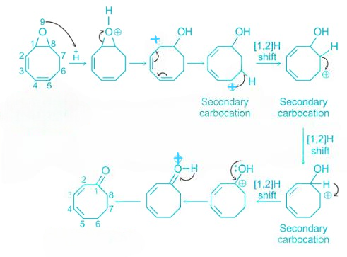 In the presence of perchloric acid, the given compound undergoes epoxide ring opening. Perchloric acid protonates the oxygen atom of the epoxide.