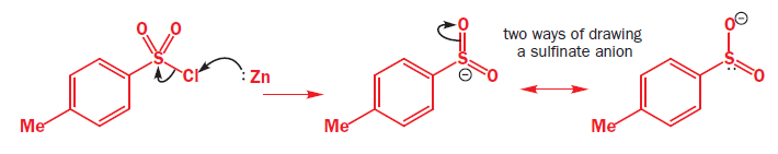 In the above reaction tosyl (toluene-para-sulfonyl) chloride [TsCl], reacts with Zn metal. Zinc provides two electrons and turns the compound into an anion. Surprisingly, this anion is also a good soft nucleophile and attacks saturated carbon atoms through the sulfur atom.
