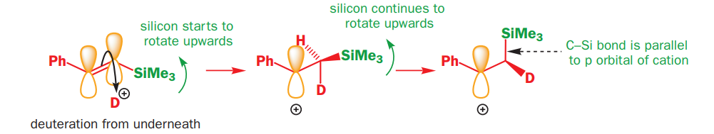 The intermediate cation has only a single bond and so rotation might be expected to lead to a mixture of geometrical isomers of the product but this is not observed. The bonding interaction between the C–Si bond and the empty p orbital means that rotation is restricted. This stabilization weakens the C–Si bond and the silyl group is quickly removed before any further rotation can occur. The stabilization is effective only if the C–Si bond is correctly aligned with the vacant orbital, which means it must be in the same plane-rather like a π bond.