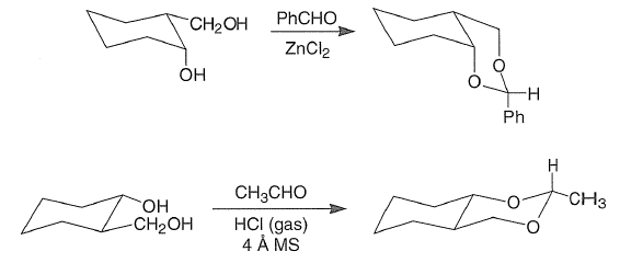Both cis- and trans-1,3-diols form cyclic acetals with aldehydes in the presence of an acid catalyst to furnish the corresponding benzylidene and ethylidene derivatives, respectively.