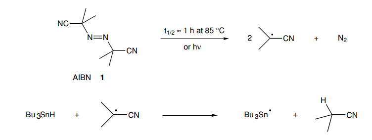 Radicals can be generated by homolysis of weak σ-bonds. Homolysis is affected by photochemical, thermal or redox (electron transfer) methods. A common method to initiate a radical reaction is to warm a peroxide such as benzoyl peroxide or azobisisobutyronitrile (AIBN). The radical • C(CN)Me2 generated from AIBN is rather unreactive, but is capable of abstracting a hydrogen atom from weakly bonded molecules such as tributyltin hydride. The resulting tributyltin radical reacts readily with alkyl halides, selenides and other substrates to form a carbon-centred radical.