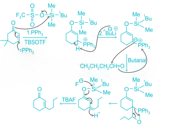The ylide reacts with butanal (Wittig reaction) to give the alkene along with triphenylphosphine oxide. In the last step, TBAF reacts with the tert-butyldimethylsilyl group and deprotects the alcohol group.