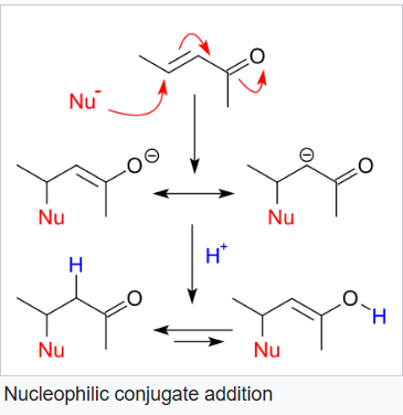 With α,β-unsaturated carbonyl compounds such as cyclohexenone it can be deduced from resonance structures that the β position is an electrophilic site which can react with a nucleophile. The negative charge in these structures is stored as an alkoxide anion. Such a nucleophilic addition is called a nucleophilic conjugate addition or 1,4-nucleophilic addition.