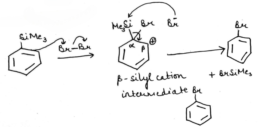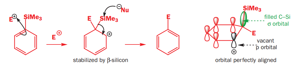 The silyl group is replaced by the electrophile at the same atom on the ring-this is known as ipso substitution. The electrophile reacts to produce the most stable cation-in this case β to silicon. Cleavage of the weakened C–Si bond by any nucleophile leads directly to the ipso product. The Latin word ipso means ‘the same’—the same site as that occupied by the SiR3 group.