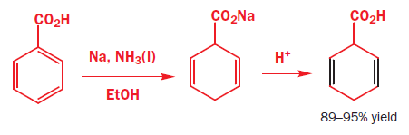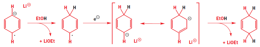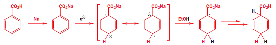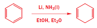 Group 1 metals, such as sodium or lithium, readily give up their single outer-shell electron as they dissolve in solvents such as liquid ammonia or ethanol. Electrons are the simplest reducing agents, and they will reduce carbonyl compounds, alkynes, or aromatic rings—in fact any functional group with a low-energy π* orbital into which the electron can go. We shall start by looking at the dissolving metal reduction of aromatic rings, known as the Birch reduction.