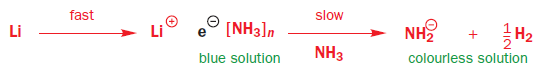 The first thing to note is that when lithium or sodium dissolve in ammonia they give an intense blue solution. Blue is the colour of solvated electrons: these group 1 metals ionize to give Li+ or Na+ and e-(NH3)n—the gaps between the ammonia molecules are just the right size for an electron. With time, the blue colour fades, as the electrons reduce the ammonia to NH2- and hydrogen gas.