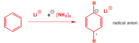 Birch reductions use those blue solutions, with their solvated electrons, as reducing agents. The reduction of NH3 to NH2- and H2 is quite slow, and a better electron acceptor will get reduced in preference. In the example above, the electrons go into benzene’s lowest lying antibonding orbital (its LUMO). The species we get can be represented in several ways, all of them radical anions (molecules with one excess, unpaired electron).