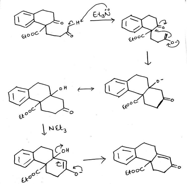 The mechanism combines two important reactions. The first stage is the formation of the stable enolate and the conjugate addition to the enone. The second stage is the formation of a new enolate on the other side of the ketone from the first. Note that the original enolate, the intermediate in the conjugate addition, can cyclize to give only an unstable four-membered ring so this cyclization would be reversible. The next intermediate, the aldol product, is often isolated from Robinson annelations. The final stage is dehydration of the aldol and an E1cB reaction that involves the carbonyl group as in a standard aldol reaction. Another enolate must form in the same position as the last.