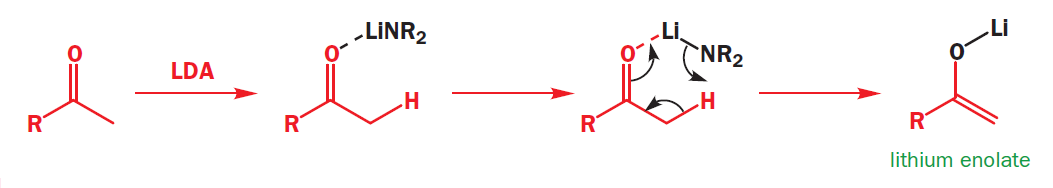 Lithium enolates are usually made at low temperature in THF with a hindered lithium amide base (often LDA) and are stable under those conditions because of the strong O–Li bond. The formation of the enolate begins with Li–O bond formation before the removal of the proton from the a position by the basic nitrogen atom.