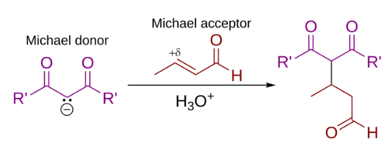 In organic chemistry, the Michael reaction or Michael 1,4 addition is a reaction between a Michael donor (an enolate or other nucleophile) and a Michael acceptor (usually an α,β-unsaturated carbonyl) to produce a Michael adduct by creating a carbon-carbon bond at the acceptor's β-carbon.