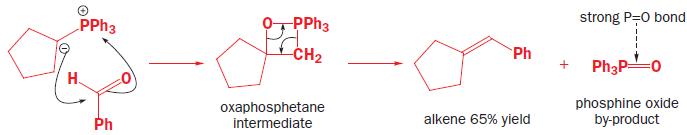 Ylids can be isolated, but are usually used in reactions immediately they are formed. They are nucleophilic species that will attack the carbonyl groups of aldehydes or ketones, generating the four-membered ring oxaphosphetane intermediates. Oxaphosphetanes are unstable: they undergo elimination to give an alkene (65% yield for this particular example) with a phosphine oxide as a byproduct. The phosphorus–oxygen double bond is extremely strong and it is this that drives the whole reaction forward.