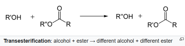 Transesterification is the process of exchanging the organic functional group R″ of an ester with the organic group R' of an alcohol. These reactions are often catalyzed by the addition of an acid or base catalyst. Strong acids catalyze the reaction by donating a proton to the carbonyl group, thus making it a more potent electrophile. Bases catalyze the reaction by removing a proton from the alcohol, thus making it more nucleophilic.