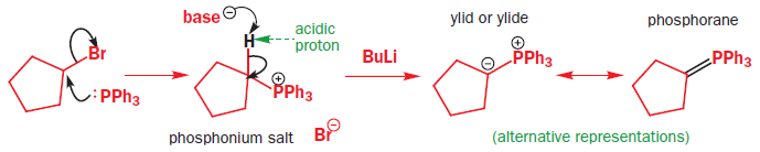 Phosphorus atoms, especially those that are positively charged or that carry electronegative substituents, can increase the acidity of protons adjacent to them on the carbon skeleton. Phosphonium salts (made in a manner analogous to the formation of ammonium salts from amines, in other words, by reaction of an alkyl halide with a phosphine) can therefore be deprotonated by a moderately strong base to give a species known as an ylid, carrying (formally) a positive and a negative charge on adjacent atoms. Ylids can alternatively be represented as doubly bonded species, called phosphoranes.