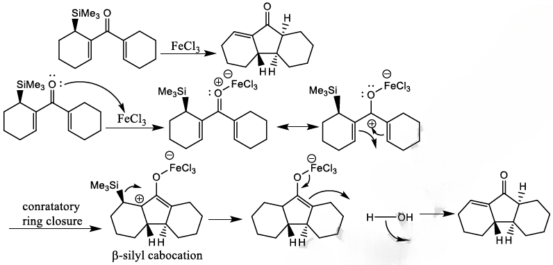 The Nazarov cyclization involves the activation of a divinyl ketone using a stoichiometric Lewis acid or protic acid promoter. The key step of the reaction mechanism involves a cationic 4π-electrocyclic ring closure which forms the cyclopentenone product.