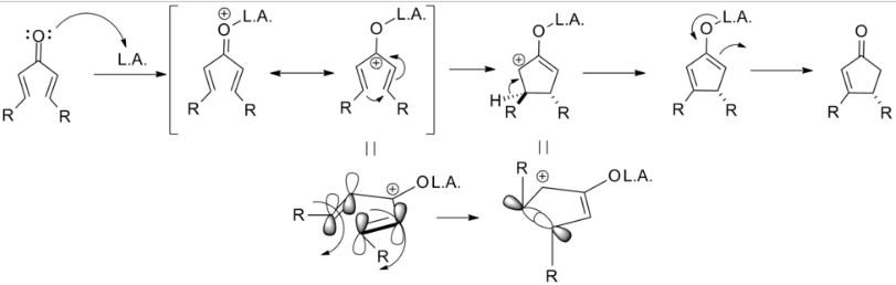 Activation of the ketone by the acid catalyst generates a pentadienyl cation, which undergoes a thermally allowed 4π conrotatory electrocyclization as dictated by the Woodward-Hoffman rules. This generates an oxyallyl cation which undergoes an elimination reaction to lose a β-hydrogen. Subsequent tautomerization of the enolate produces the cyclopentenone product.