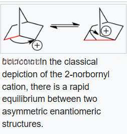 A nonclassical ion usually refers to carbonium ions, a family of organic cations. They are characterized by delocalized three-center, two-electron bonds. The more stable members are often bi- or polycyclic. The term 2-norbornyl cation describes a carbonium ionic derivative of norbornane.