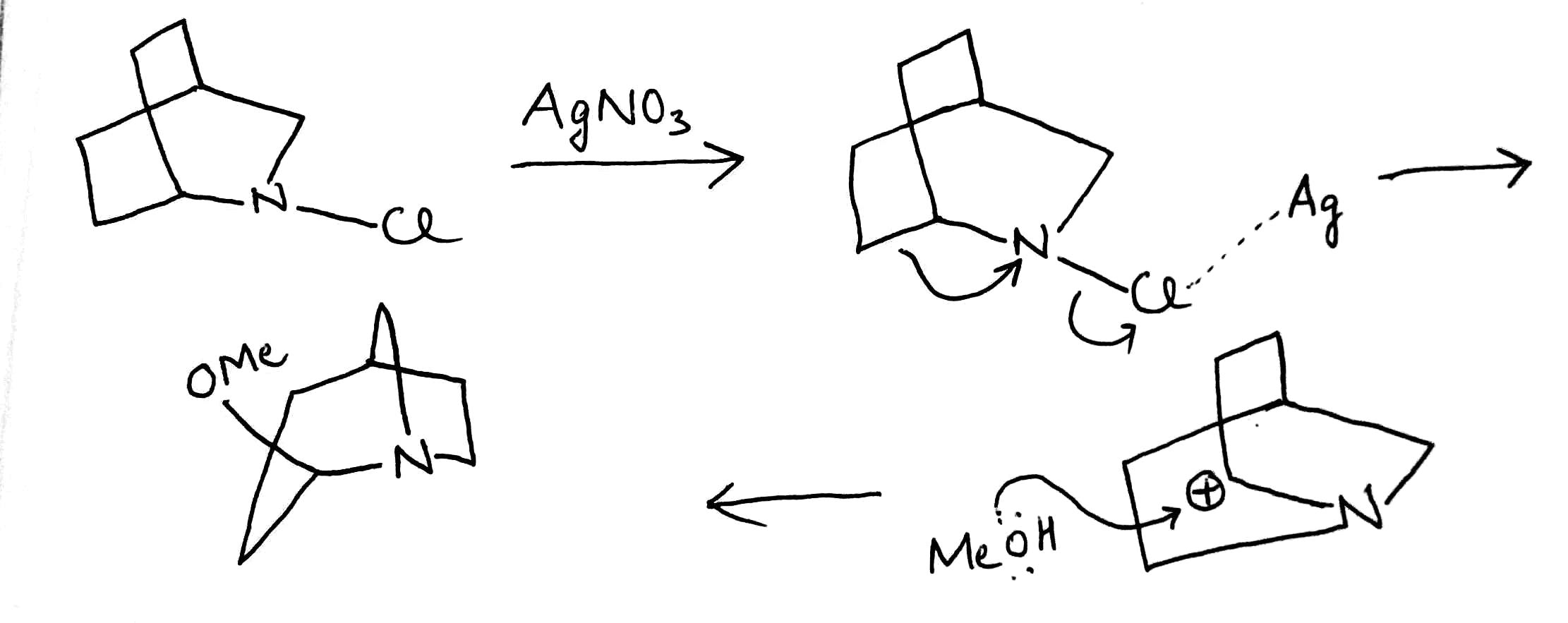 In the given reaction, Ag+ assists Cl-'s departure. As the nitrogen atom cannot bear a positive charge due to its high electronegativity, the neighbouring C-C bond simultaneously attacks the nitrogen atom.
