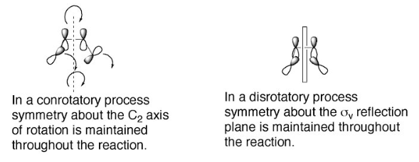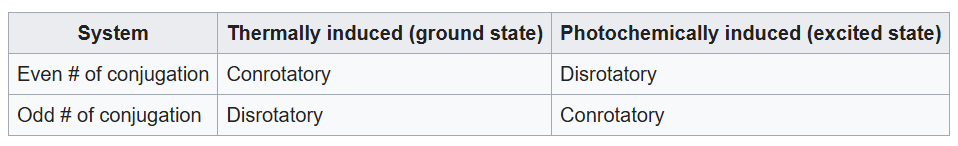 Depending on the type of reaction (photochemical or thermal) and the number of pi electrons, the reaction can happen through either a conrotatory or disrotatory mechanism.