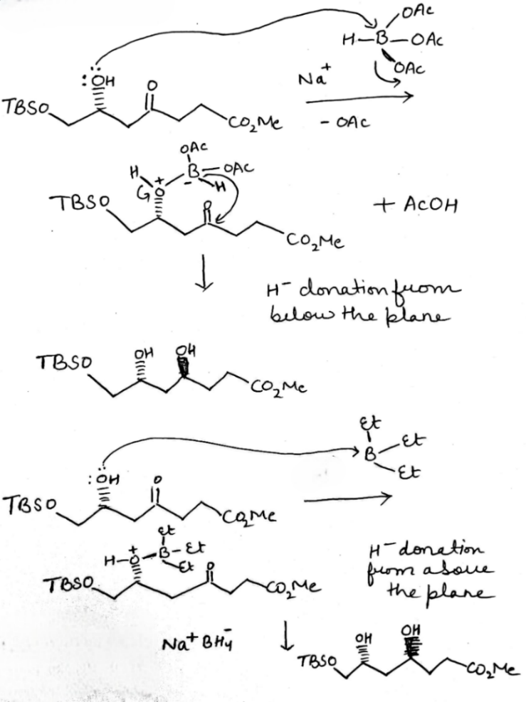 In the formation of B, due to the presence of bulky group (containing H-) below the plane, the attack of H- will occur from below the plane and therefore OH group goes above the plane.