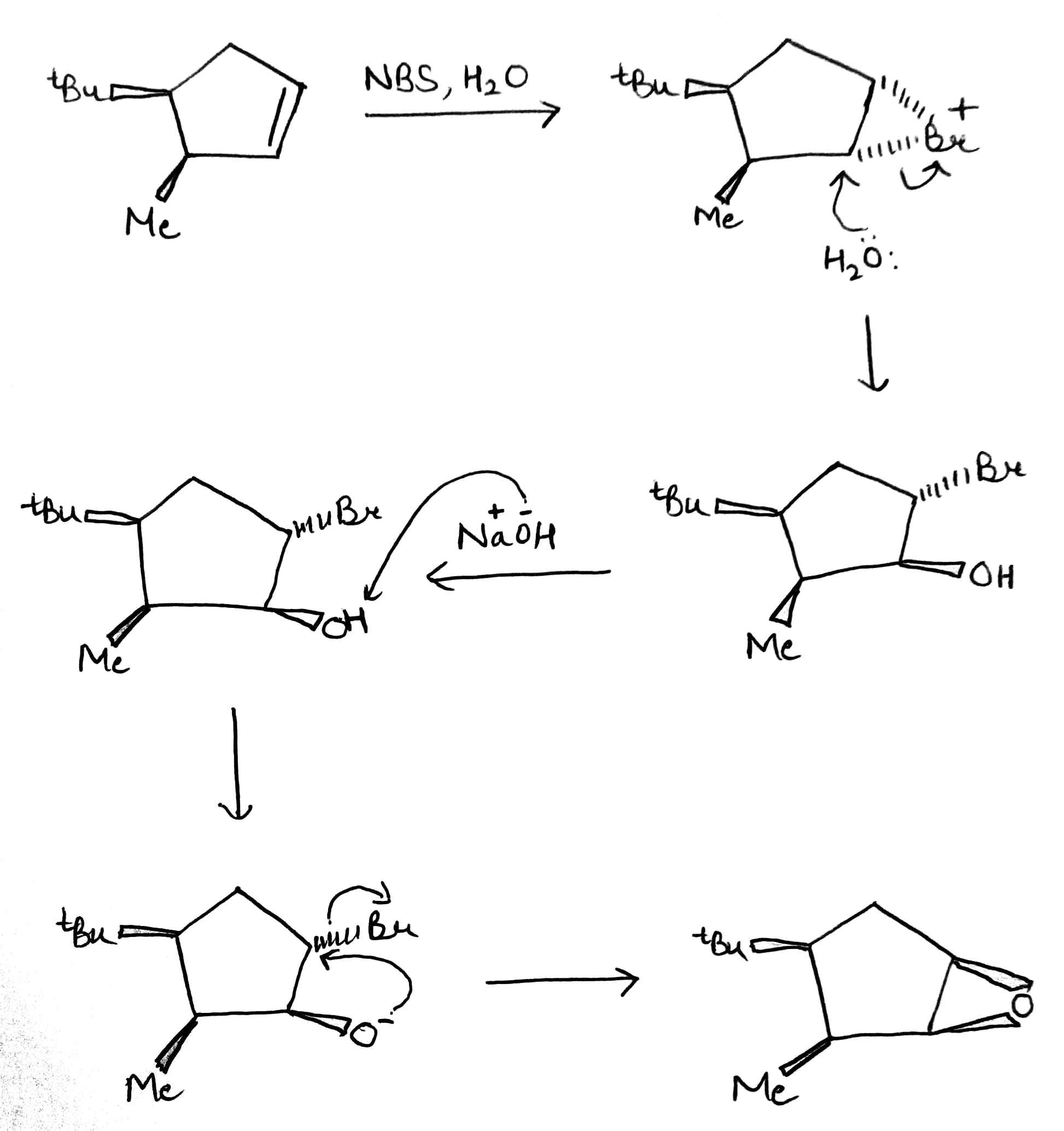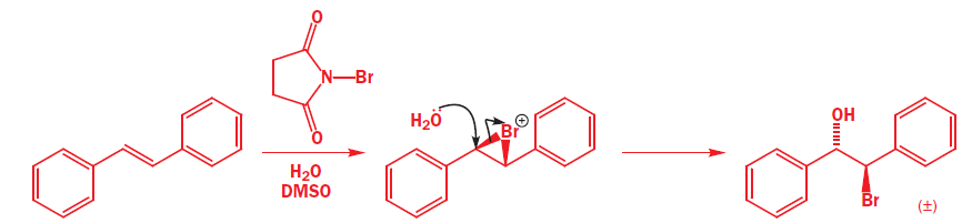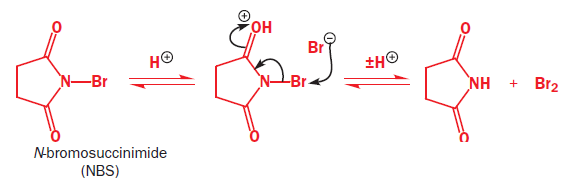 The reagent used to form the bromonium ion is called N-bromosuccinimide, or NBS for short. Unlike the noxious brown liquid bromine, NBS is an easily handled crystalline solid, and is perfect for electrophilic addition of bromine to alkenes when the bromonium ion is not intended to be opened by Br-.It works by providing a very small concentration of Br2 in solution: a small amount of HBr is enough to get the reaction going, and thereafter every addition reaction produces another molecules of HBr which liberates more Br2 from NBS. In a sense, NBS is a source of ‘Br+’.