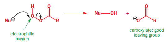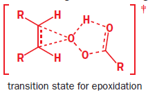 The most commonly used epoxidizing agents are peroxy-carboxylic acids. Peroxy-acids (or peracids) have an extra oxygen atom between the carbonyl group and their acidic hydrogen—they are half-esters of hydrogen peroxide (H2O2).They are rather less acidic than carboxylic acids because their conjugate base is no longer stabilized by delocalization into the carbonyl group reagent. But they are electrophilic at oxygen, because attack there by a nucleophile displaces carboxylate, a good leaving group. The LUMO of a peroxy-carboxylic acid is the