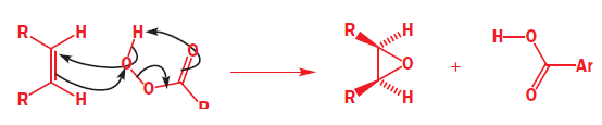 Start with the nucleophilic π bond: send the electrons on to oxygen, breaking O–O and forming a new carbonyl bond. Use those electrons to pick up the proton, and use the old O–H bond’s electrons to make the second new C–O bond. Because both new C–O bonds are formed on the same face of the alkene’s π bond, the geometry of the alkene is reflected in the stereochemistry of the epoxide. The reaction is therefore stereospecific.