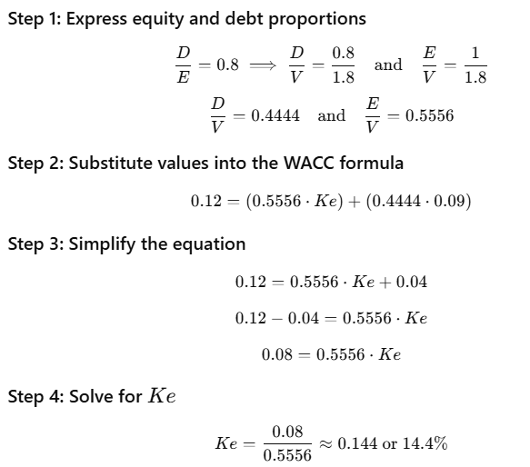 To calculate the cost of equity (Ke) under the Net Operating Income (NOI) approach, we use the following formula derived from the relationship between the weighted average cost of capital (WACC), cost of debt (Kd), and the capital structure: