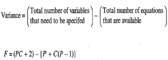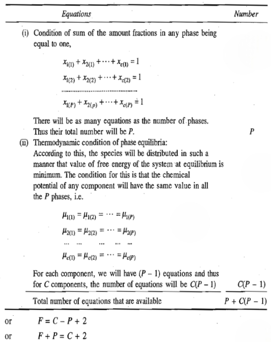 Mathematically, we know that the number of variables that can be obtained from a set of equations is equal to the number of equations. Thus if there are as many equations as there are variables, then the temperature, pressure and composition of the whole system in equilibrium can be determined. Such a system, is the nonvariant system. If the number of variables exceeds the number of equations by one, then the equilibrium of the system cannot be determined until one of the variables is arbitrarily chosen. Such a system is called monovariant (or univariant) and has one degree of freedom. Thus we see that the excess of variables over equations, which is called the variance F of the system, is given as