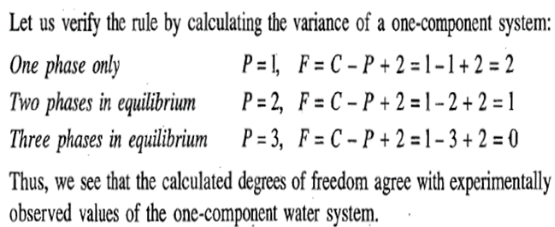For an illustration, we cite an example of water system. If only one phase is present (solid, liquid or gas), then we have to describe values of at least two parameters, namely, temperature and pressure, in order to define the system. For example, we can have liquid water under different conditions of temperature and pressure. Thus, the water system has two degrees of freedom or it is bivariant. Now consider two phases in equilibrium, for example, solid and liquid water, i.e.