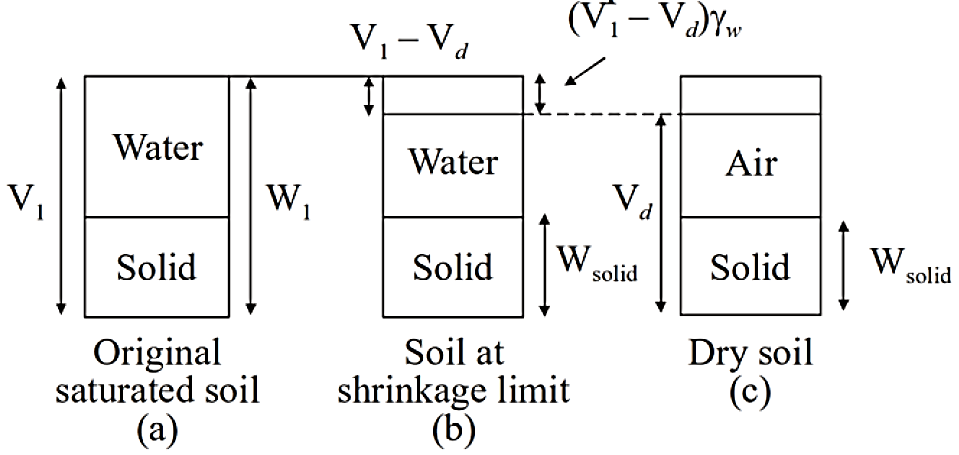 At shrinkage limit, (a) S = 1, (b) there are two phases (soil & water), (c) no volume change.