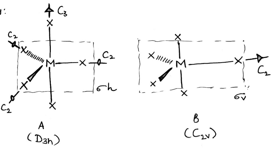 A molecule that has an n-fold principal axis and n twofold axes perpendicular to Cn belongs to the group Dn. A molecule belongs to Dnh if it also possesses a horizontal mirror plane.