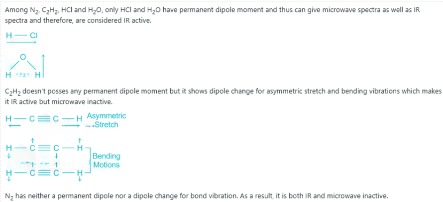 Transitions between rotational states can be observed in molecules with a permanent electric dipole moment. A consequence of this rule is that no microwave spectrum can be observed for centrosymmetric linear molecules such as N2 (dinitrogen) or HCCH (ethyne), which are non-polar.