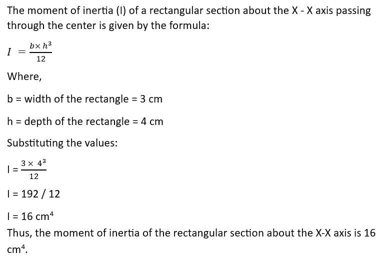 The moment of inertia of a rectangular section 3 cm wide and 4 cm deep about X - X axis passing through the center is-