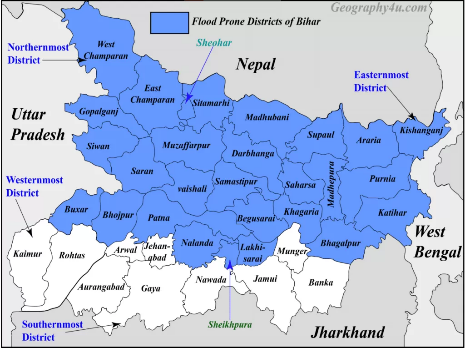 76% of its population in the northern region living under the recurring threat of floods. The primary reason for this is the state's location in the Ganga Basin, combined with rivers like the