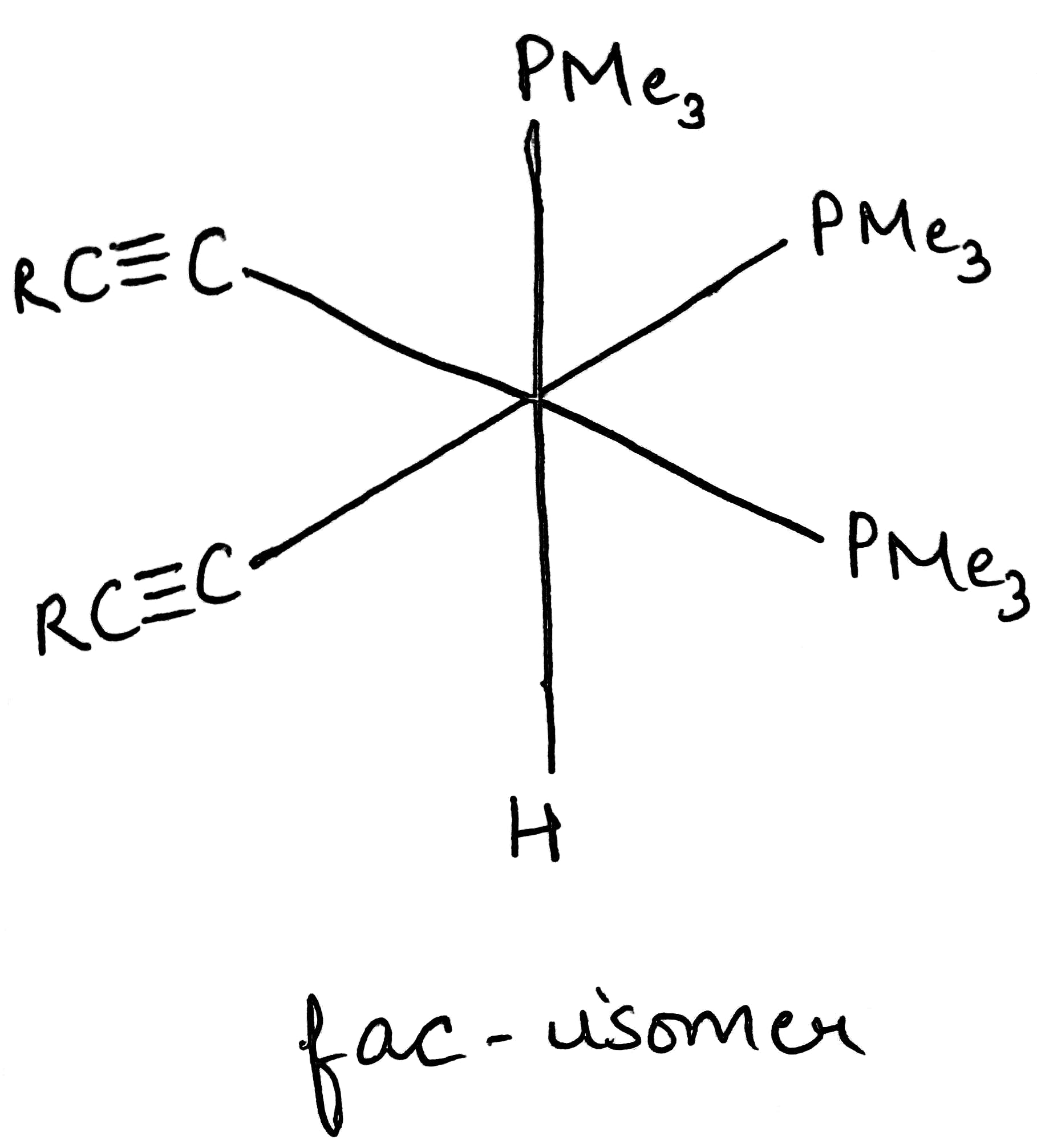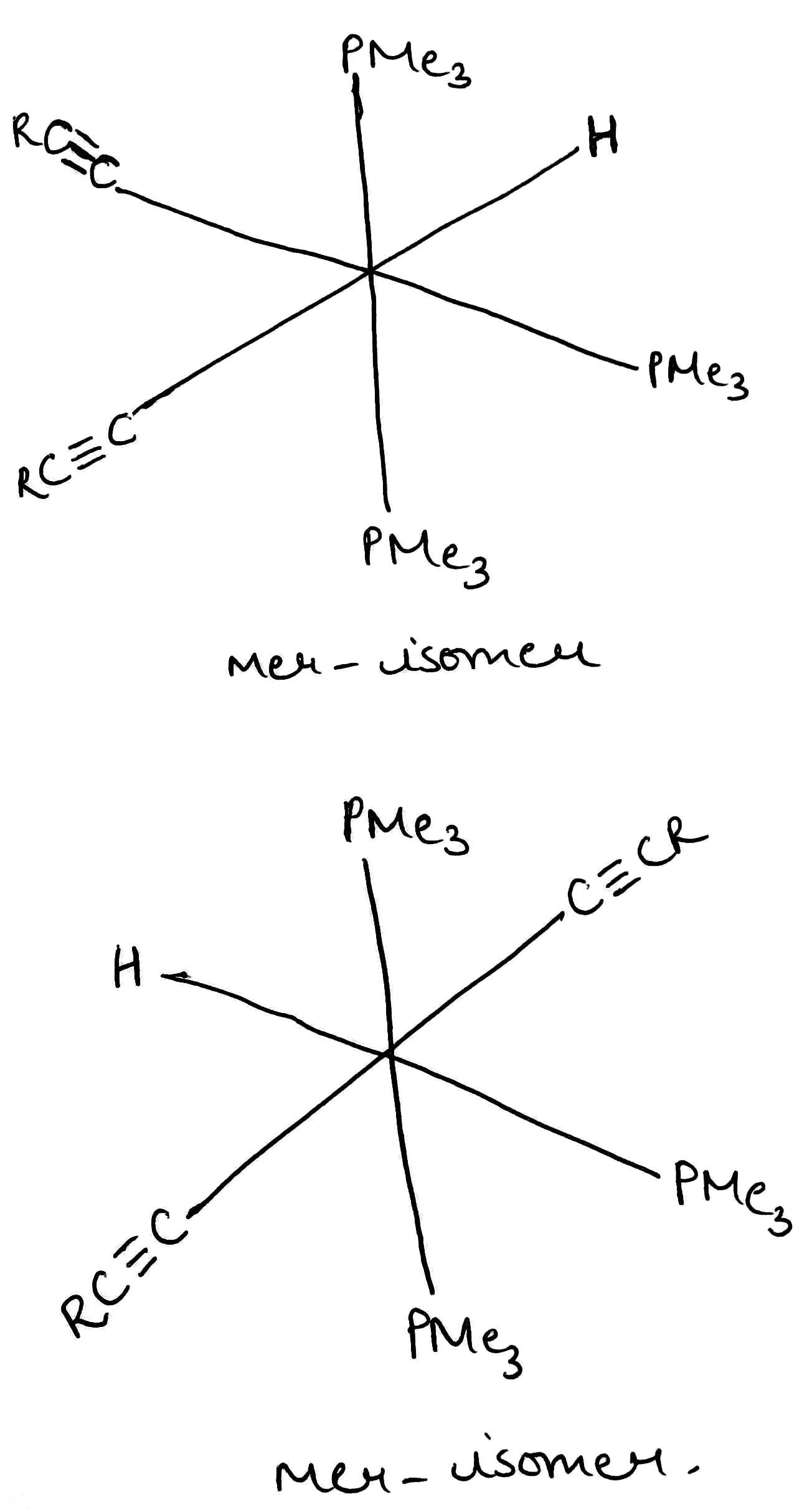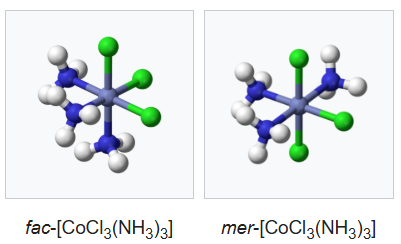A type of isomerism in octahedral MX3Y3 complexes is facial–meridional (or fac–mer) isomerism, in which different numbers of ligands are cis or trans to each other. When three identical ligands occupy one face of an octahedron, the isomer is said to be facial, or fac. In a fac isomer, any two identical ligands are adjacent or cis to each other. If these three ligands and the metal ion are in one plane, the isomer is said to be meridional, or mer. A mer isomer can be considered as a combination of a trans and a cis, since it contains both trans and cis pairs of identical ligands.
