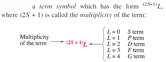 The energy and the orbital angular momentum of a multielectron species are determined by a quantum number, L. Energy states for which L=0, 1, 2, 3, 4... are known as S, P, D, F, G... terms, respectively.