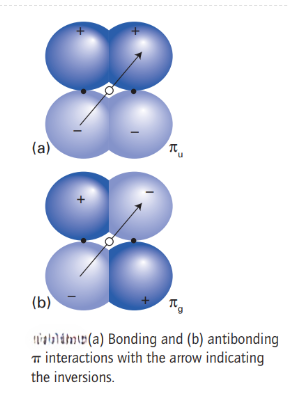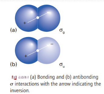 For homonuclear diatomic, it is sometimes convenient to signify the symmetry of the molecular orbitals with respect to their behaviour under inversion through the centre of the molecule. The operation of inversion consists of starting at an arbitrary point in the molecule, travelling in a straight line to the centre of the molecule, and then continuing an equal distance out on the other side of the centre. The orbital is designated g (for gerade, even) if it is identical under inversion, and u (for ungerade, odd) if it changes sign. Thus, a bonding σ orbital is g and an antibonding σ orbital is u. On the other hand, a bonding π orbital is u and an antibonding π orbital is g.