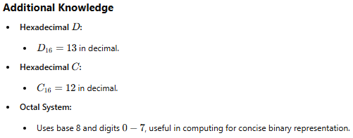 Hexadecimal to Binary Conversion: Each hexadecimal digit corresponds to a 4-bit binary equivalent.