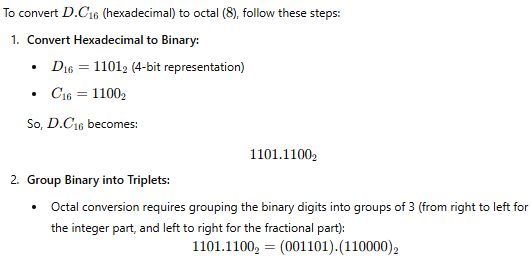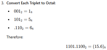 Binary to Octal Conversion: Group binary digits into triplets and convert each group to its octal equivalent.