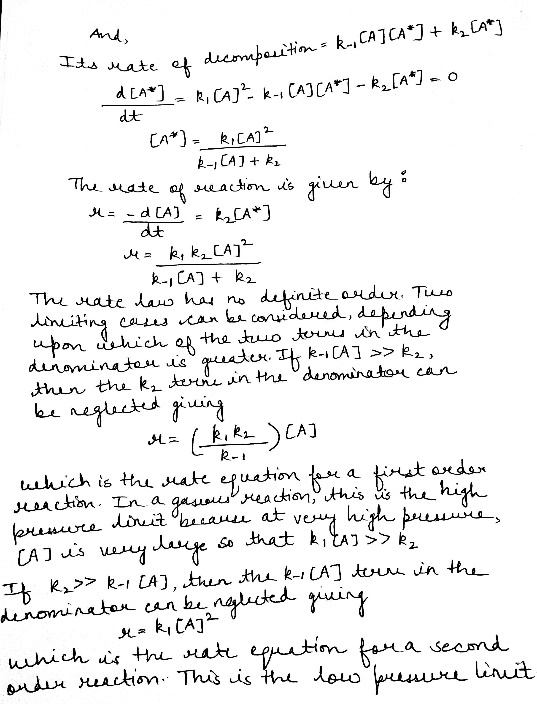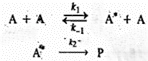 Here A* is the energized A molecule which has acquired sufficient vibrational energy to enable it to isomerize or decompose. In other words, the vibrational energy of A exceeds the threshold energy for the overall reaction A → Products. It must be borne in mind that A* is simply a molecule in a high vibrational energy level and not an activated complex. In the first step, the energized molecule A* is produced by collision with another molecule A. What actually happens is that the kinetic energy of the second molecule is transferred into the vibrational energy of the first. In fact; the second molecule need not be of the same species; it could be a product molecule or a foreign molecule present in the system which, however, does not appear in the overall stoichiometric reaction A → P. The rate constant for the energization step is k1. After the production of A*,it can either be de-energized back to A (in the reverse step, with rate constant k-1) by collision in which case its vibrational energy is transferred to the kinetic energy of an A molecule or be decomposed or isomerized to products (in the step with rate constant k2) in which case the excess vibrational energy is used to break the appropriate chemical bonds.